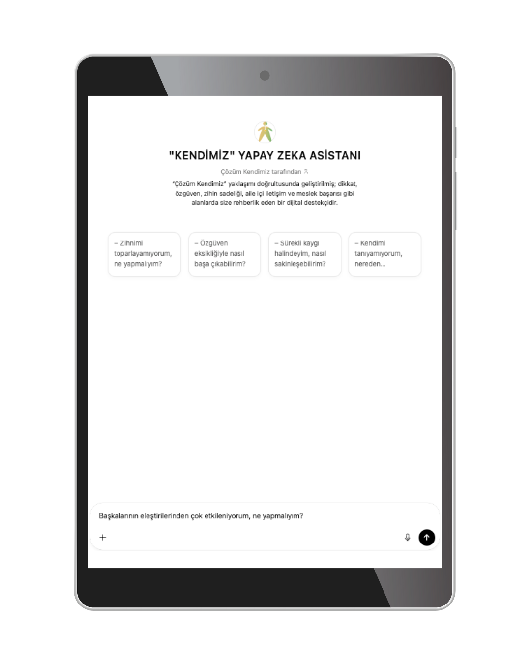Kendimiz Yapay Zeka Asistanı, “Çözüm Kendimiz” yaklaşımı doğrultusunda geliştirilmiş; dikkat, özgüven, zihin sadeliği, aile içi iletişim ve meslek başarısı gibi alanlarda size rehberlik eden bir dijital destekçidir.